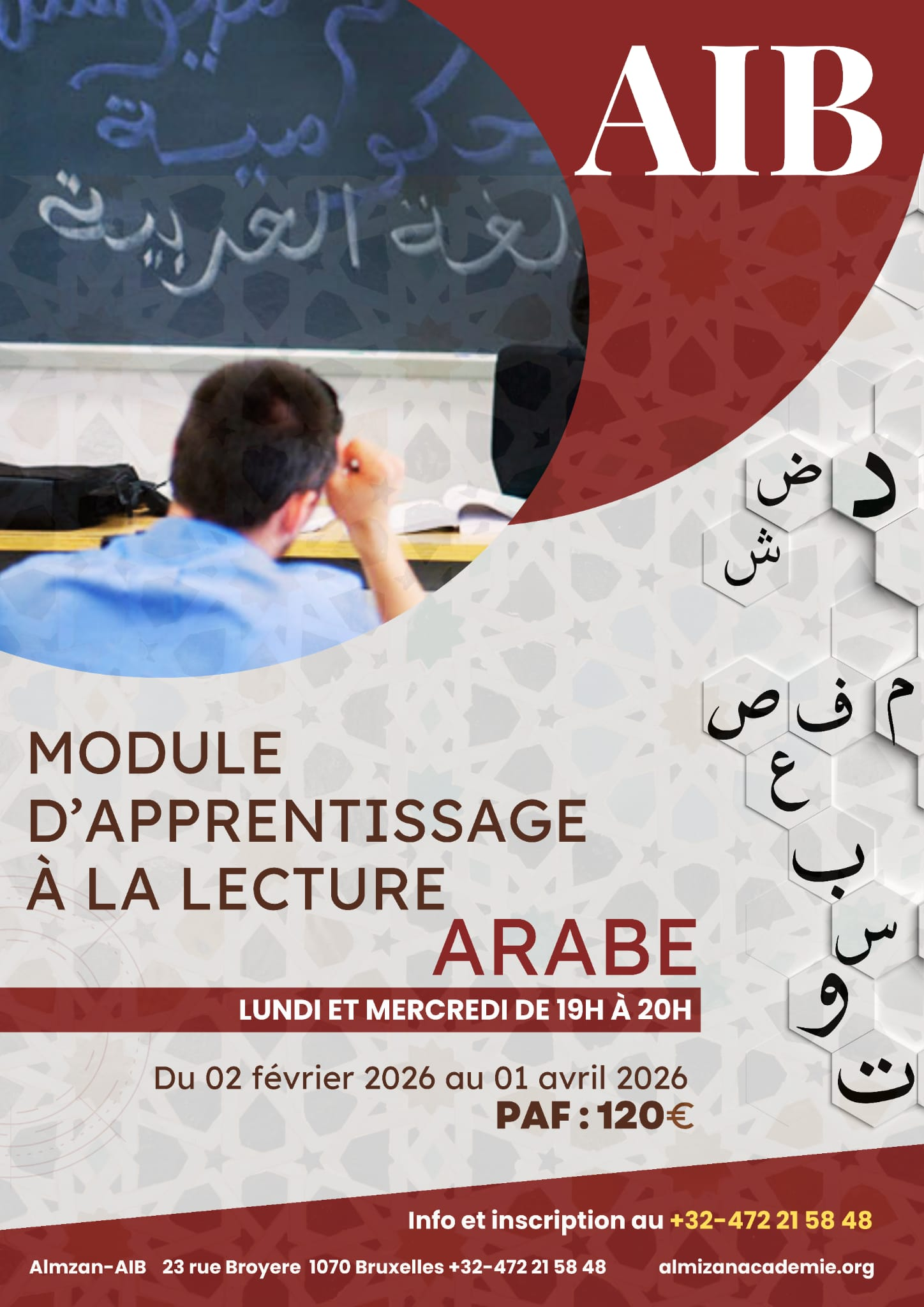 L’AIB a le plaisir d’annoncer le lancement d’un module d’alphabétisation arabe en présentiel, destiné aux adultes souhaitant renforcer leurs bases de lecture en langue arabe, dans un cadre bienveillant et accessible.